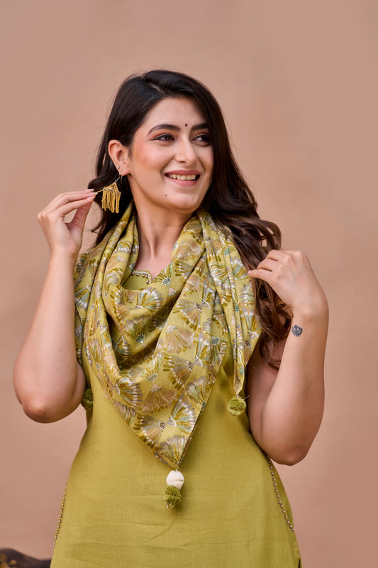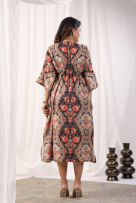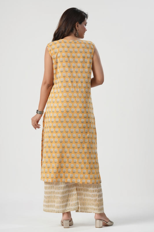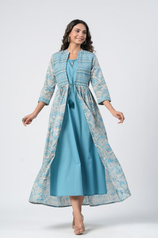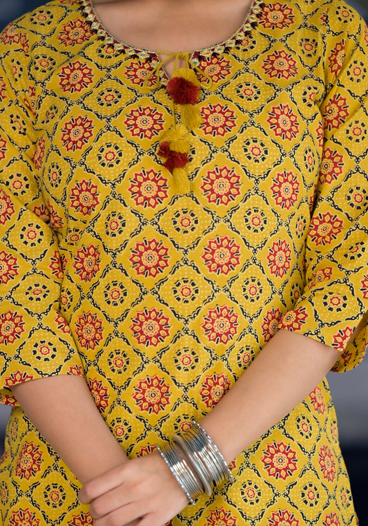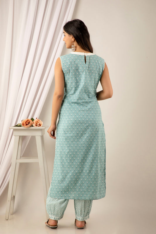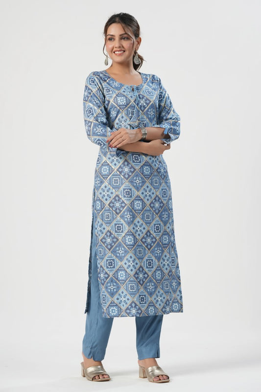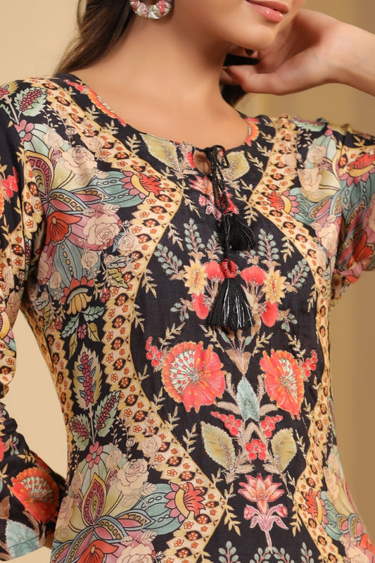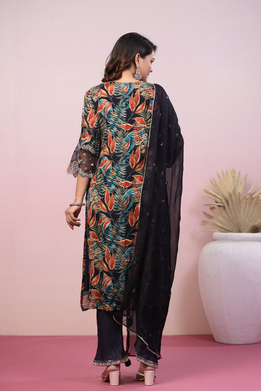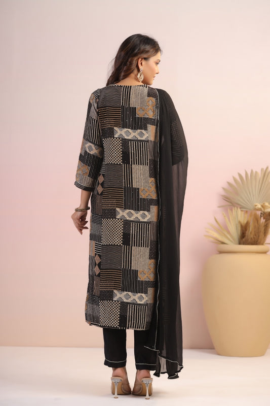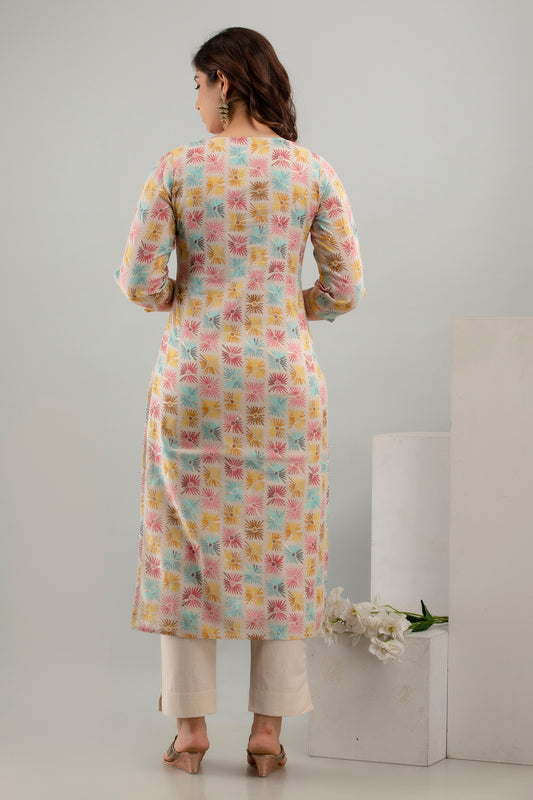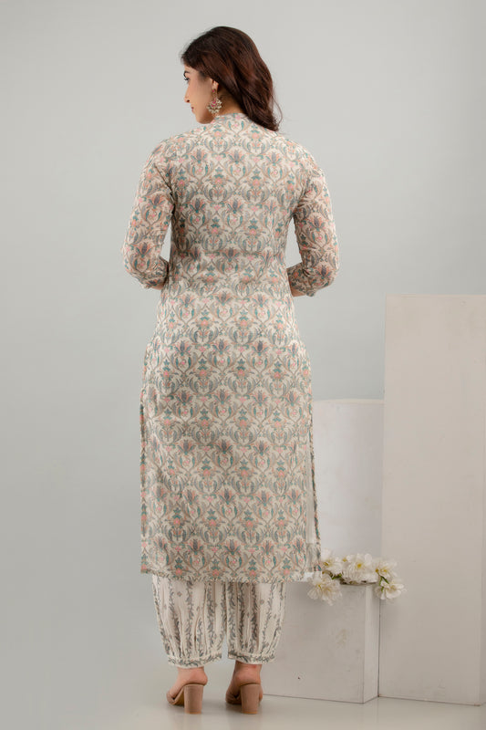 Abstract Printed & Embroidered A-Line High-Low Kurta With Pant
