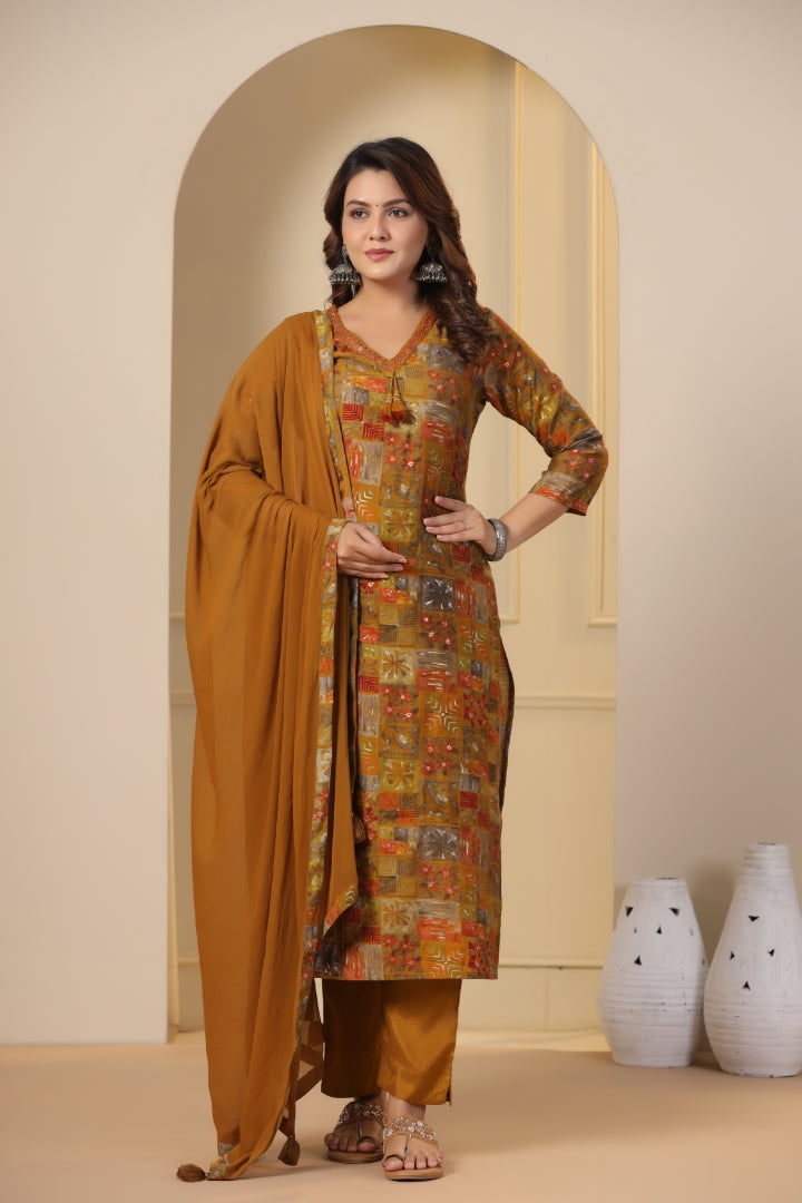 This stunning brown color printed cotton salwar suit is the perfect addition to your ethnic wardrobe. The set includes a kurta, pant, and dupatta. The kurta features intricate katdana and mirror work on the neck, adding a touch of elegance to the outfit. The shantoon pant and nazmin dupatta complement the kurta beautifully, creating a stylish and comfortable ensemble.