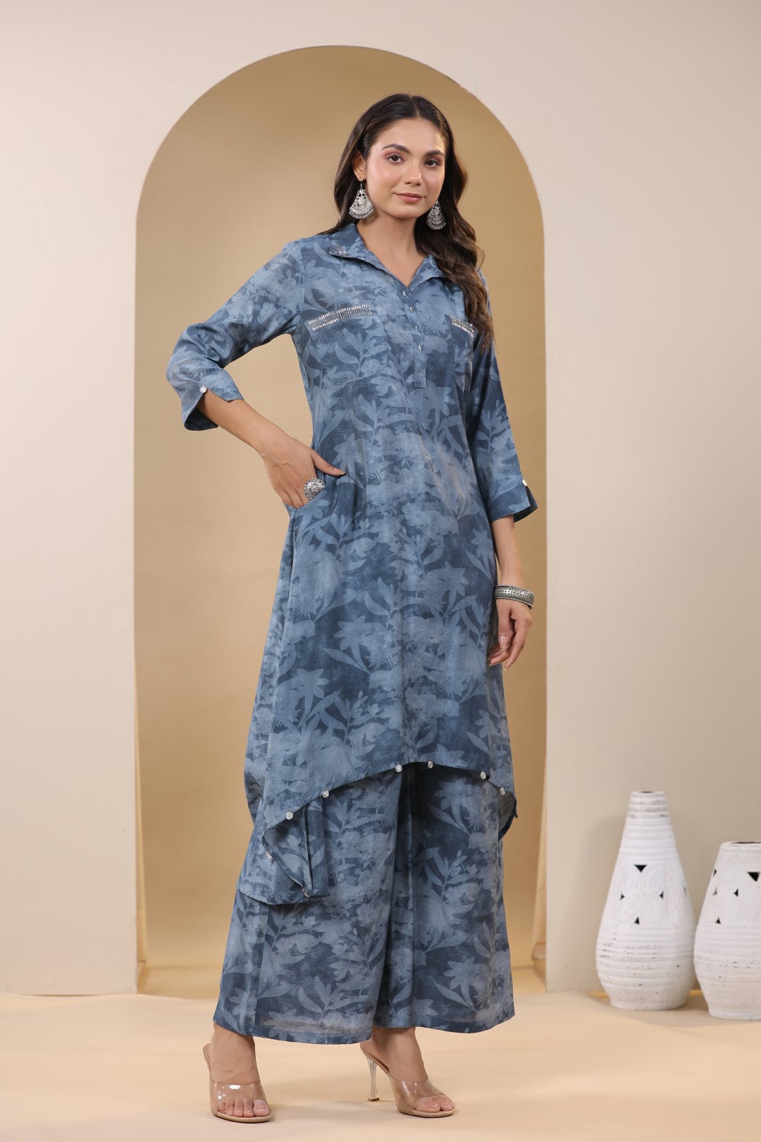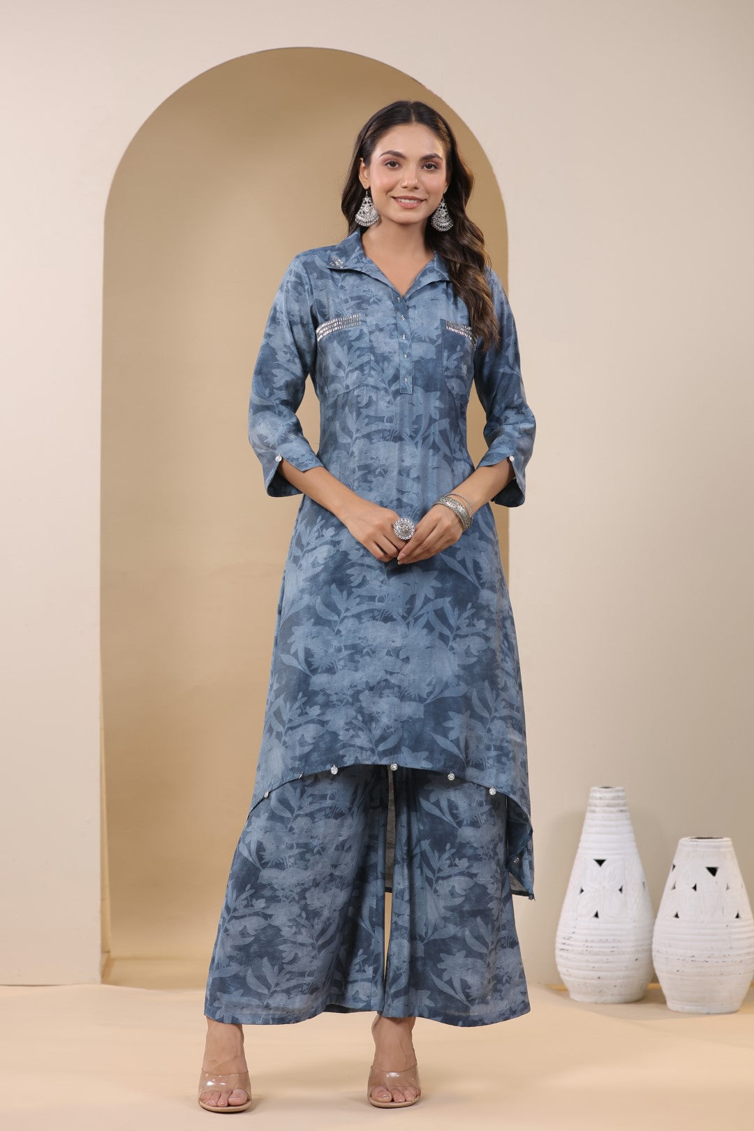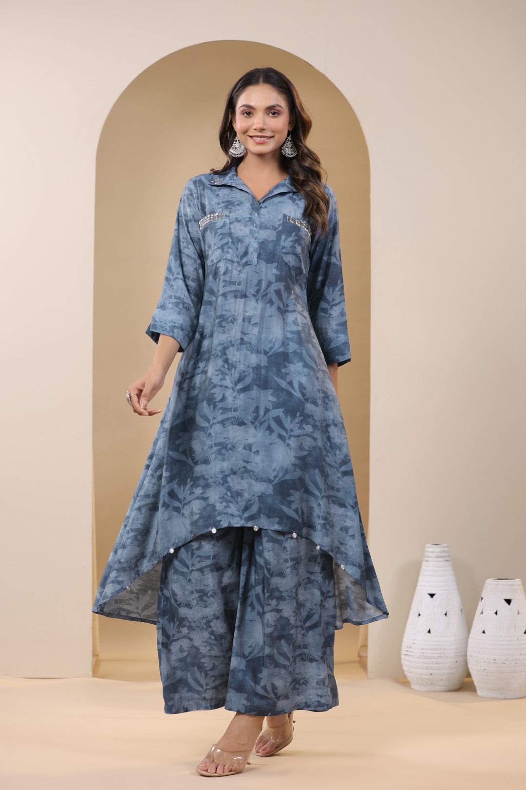 Beautiful Modal Co-Ord Set Floral Print Collar Shirt With Katdana on Yoke, Pockets and Collar