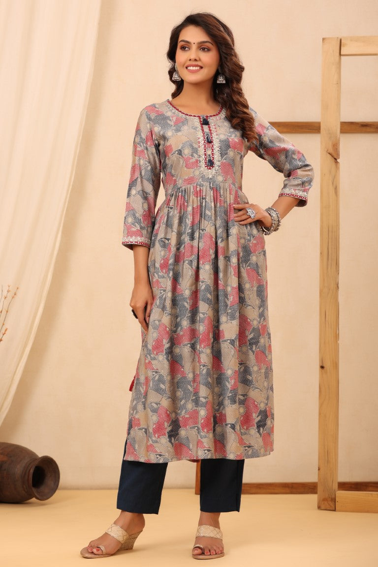 Multi color zari emroided mirror hand work on neck and sleeve, has three-quarter sleeves, with tassals on front