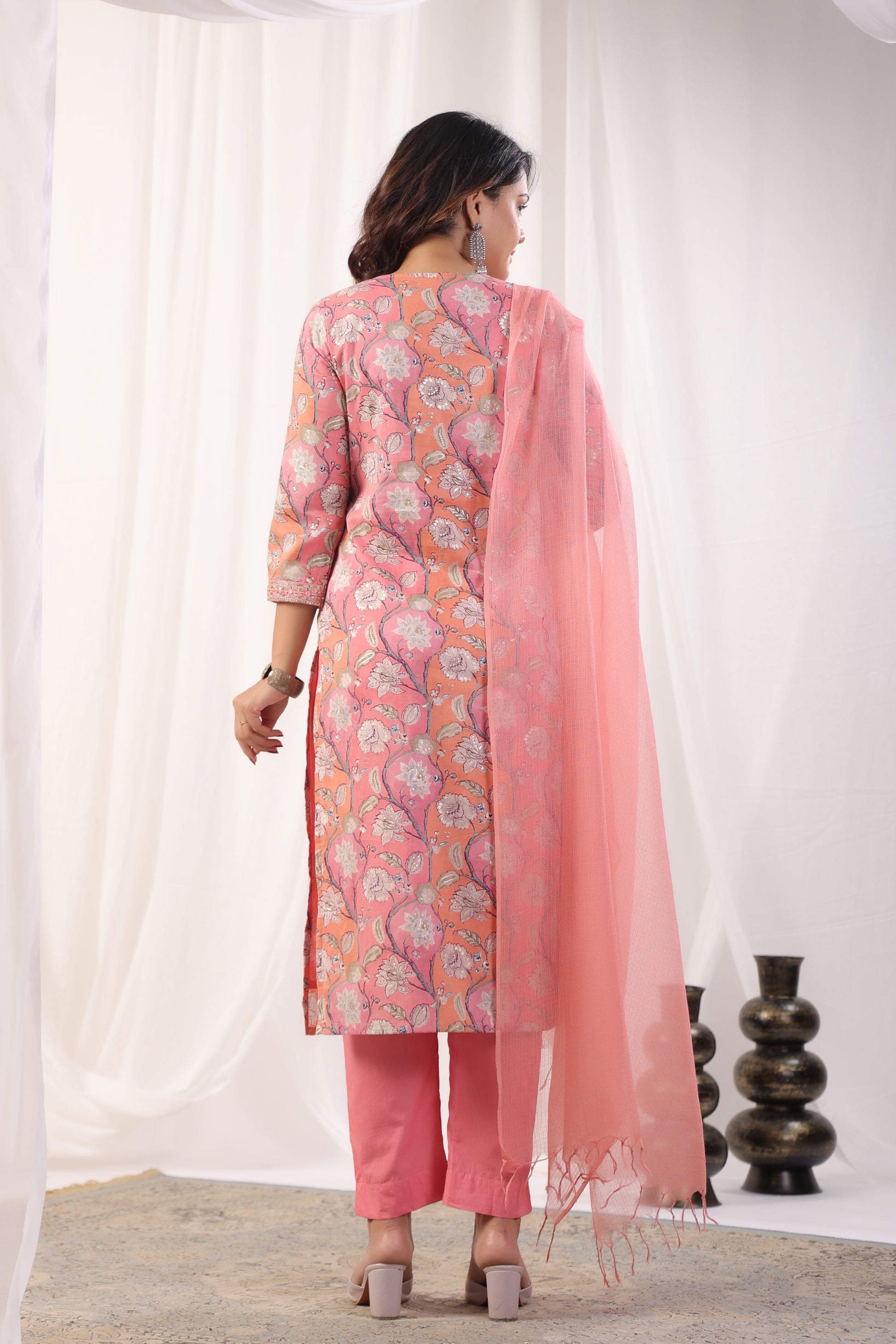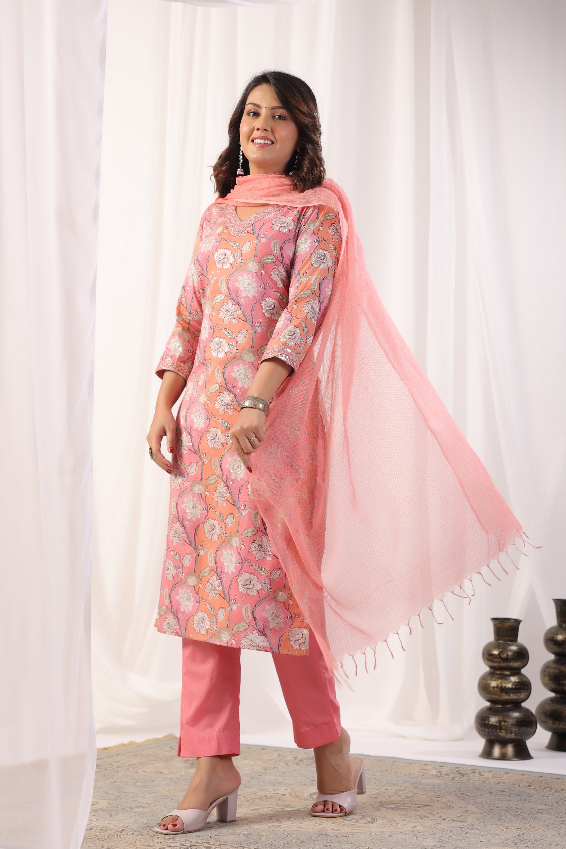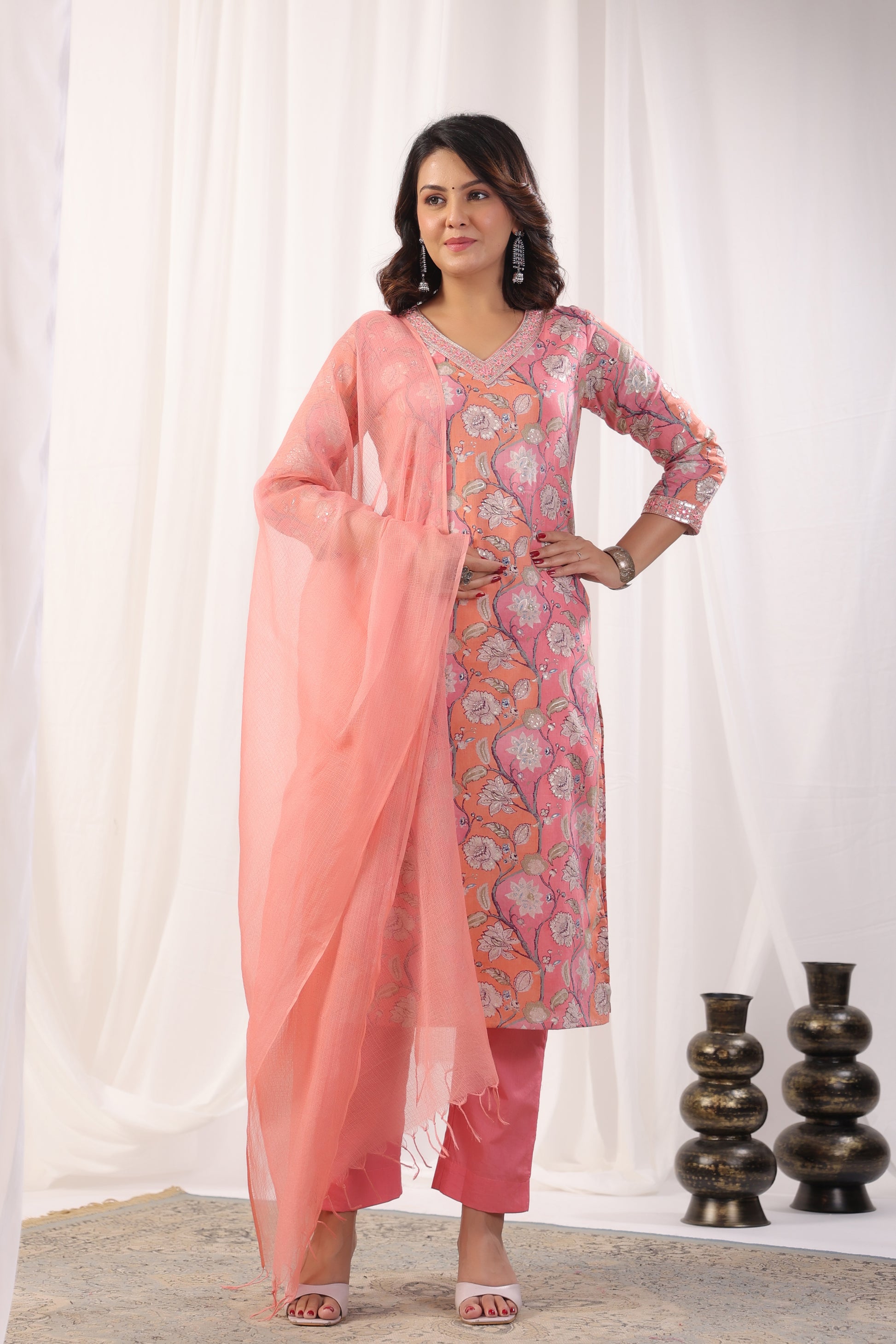Elevate your ethnic wardrobe with our exquisite Premium Mulmul Cotton Floral Printed Suit Set. This set includes a Mulmul Kurta, Cotton Pant, and Kotadoria Dupatta, all crafted from high-quality materials for ultimate comfort and style. The highlight of this suit set is the intricate Zari Embroidery with Mirror and Sequence Work on the Neck and Sleeves of the Kurta, adding a touch of elegance and sophistication to the ensemble.