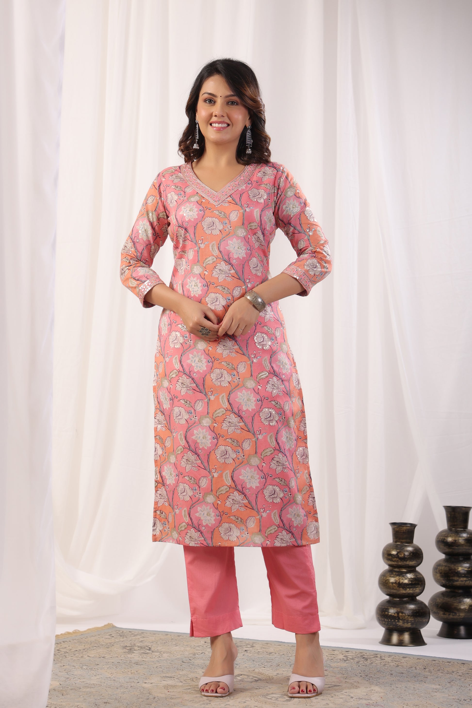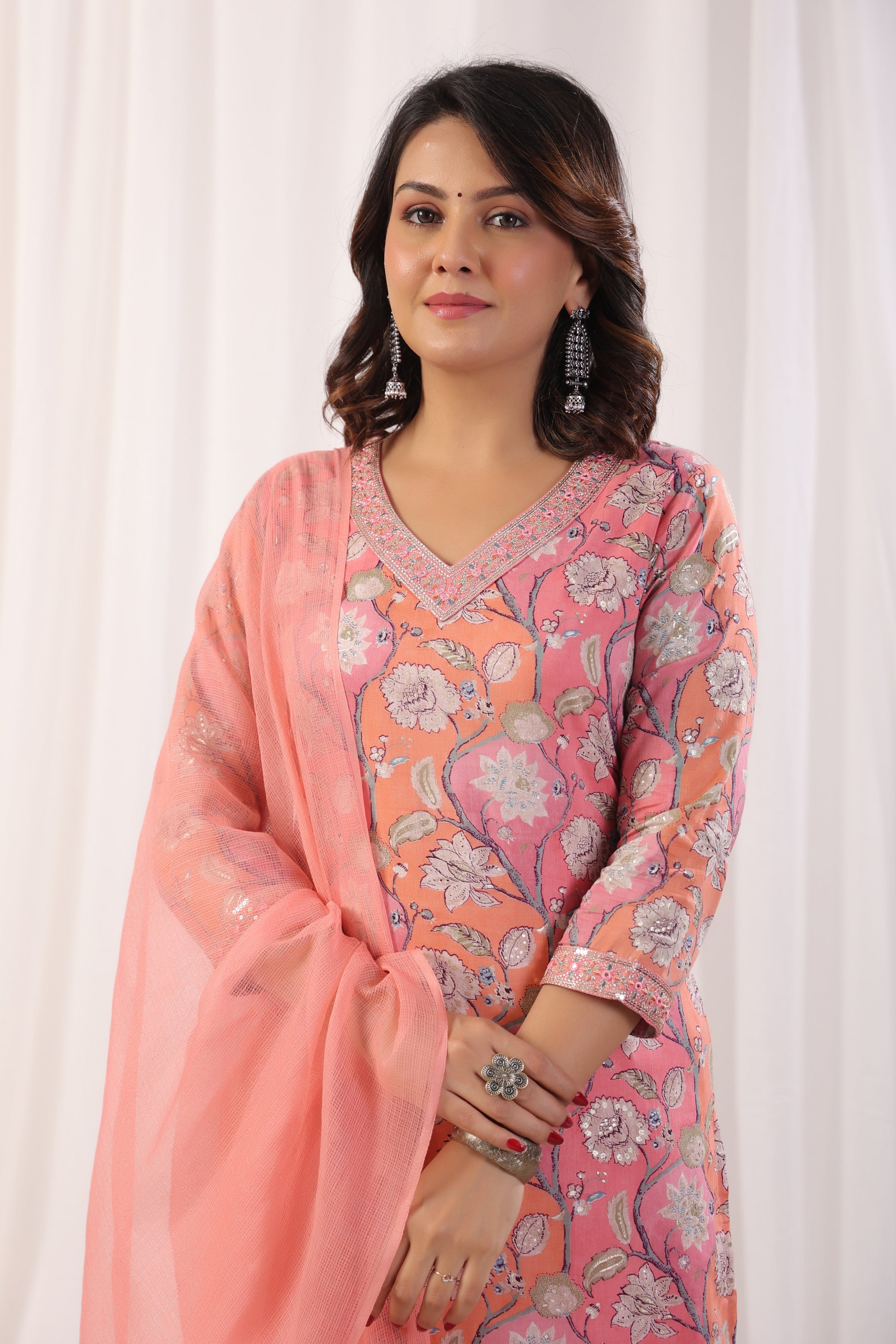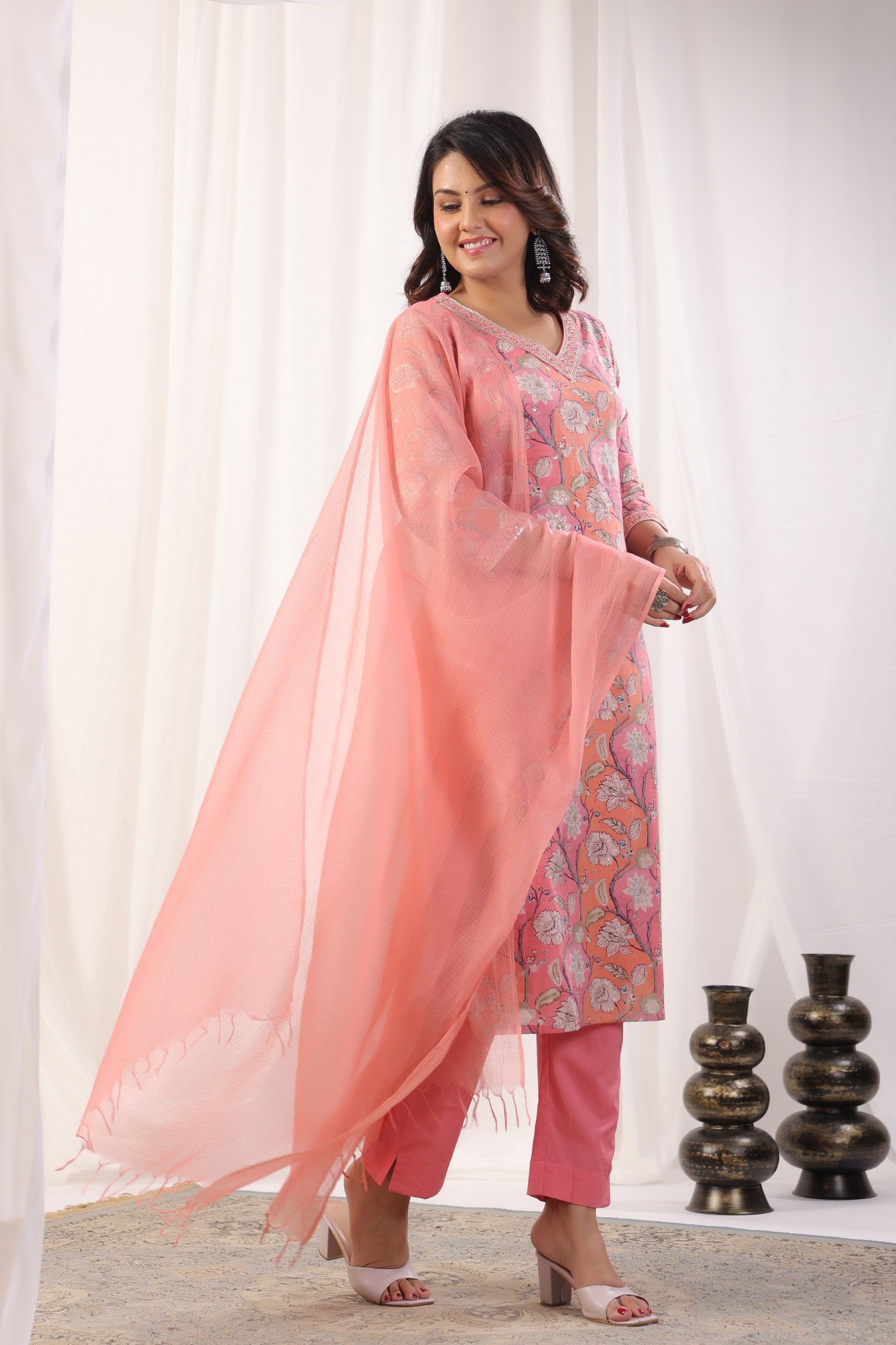 Elevate your ethnic wardrobe with our exquisite Premium Mulmul Cotton Floral Printed Suit Set. This set includes a Mulmul Kurta, Cotton Pant, and Kotadoria Dupatta, all crafted from high-quality materials for ultimate comfort and style. The highlight of this suit set is the intricate Zari Embroidery with Mirror and Sequence Work on the Neck and Sleeves of the Kurta, adding a touch of elegance and sophistication to the ensemble.