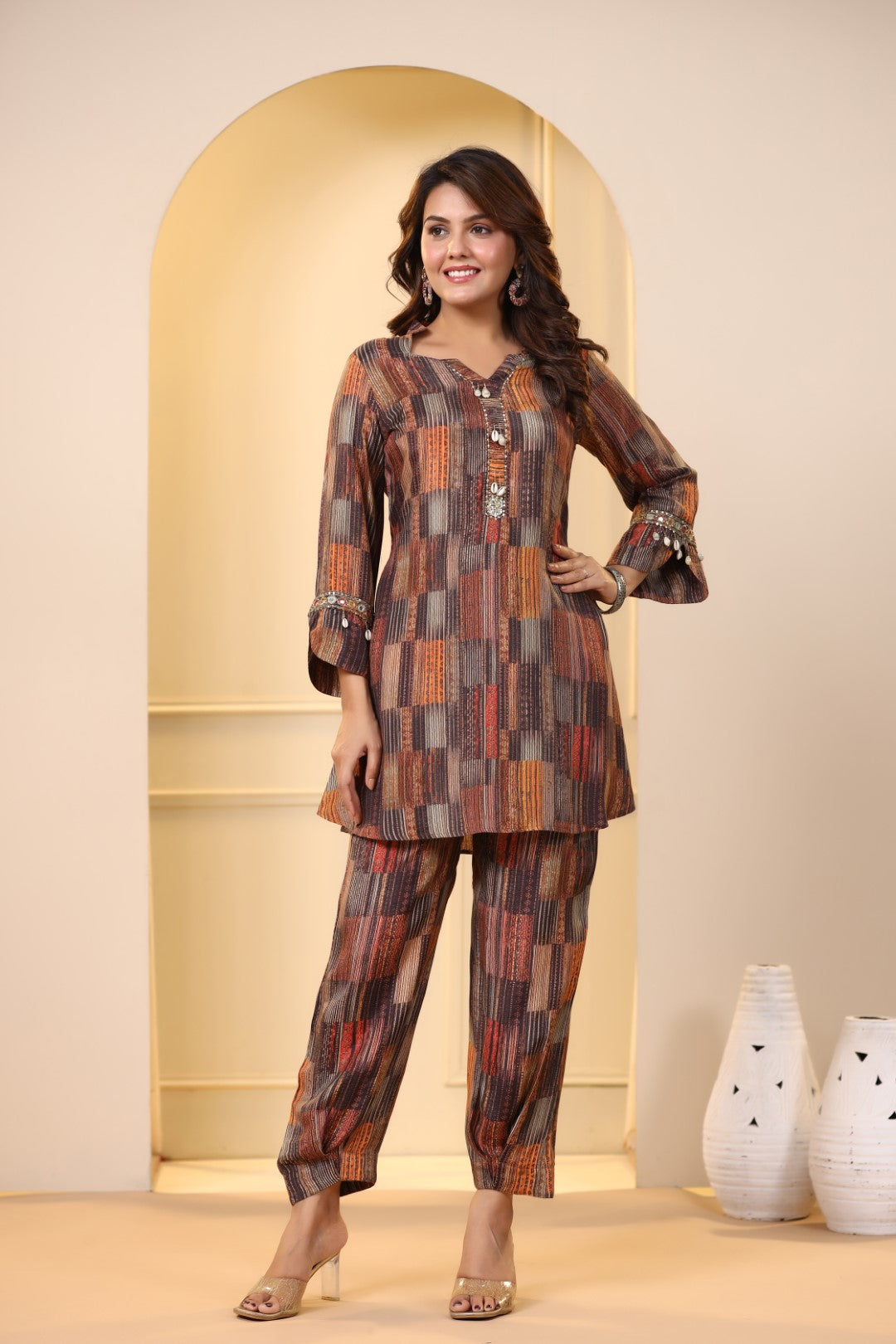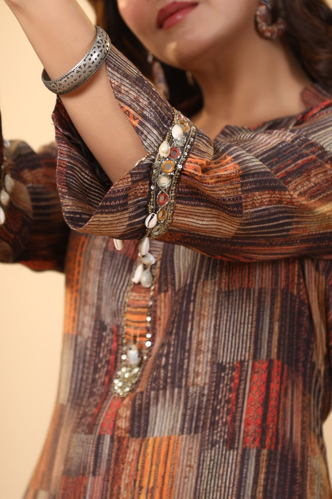 This stunning kurta pant set is made from pure muslin fabric, featuring intricate sequence and kodi work on the placket and sleeves. The ethnic printed design adds a touch of traditional charm, while the mirror work on the sleeves adds a hint of glamour to the outfit.